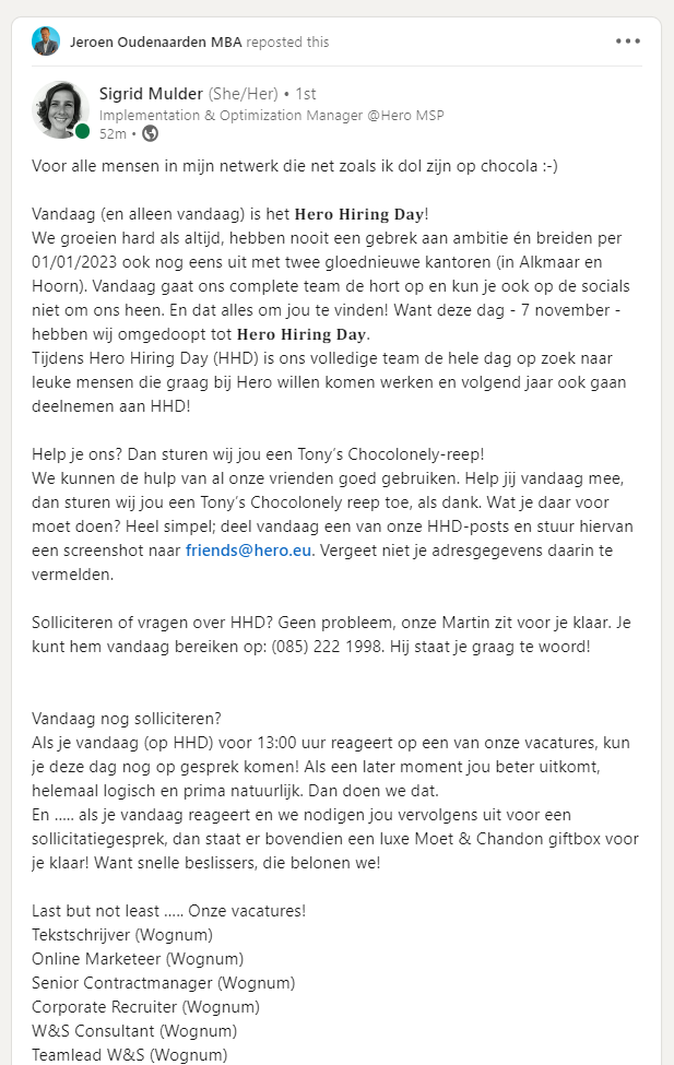 Help ons mee op Hero Hiring Day en ontvang een Tony Chocolonely reep cadeau!